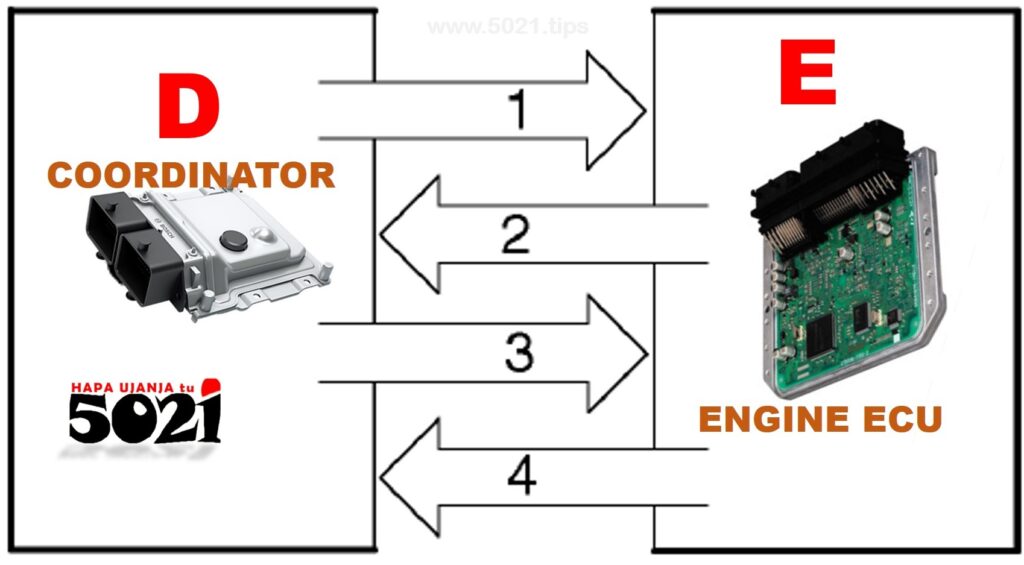 Now, the coordinator, D, that has verified the key, it also needs to verify with, E, the engine’s computer, a.k.a. ECU!