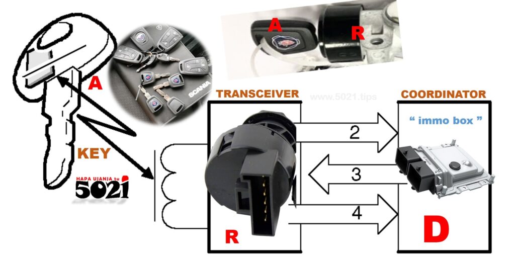 The transceiver, R, reads the data in the key, A, then sends the data to the coordinator, D, to verify whether its the correct data, meaning the correct SCANIA key inserted, seen🤔?