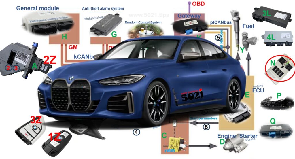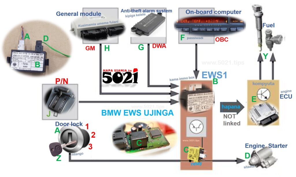 Z) Extra ‘ujanja’ was added, that only using the correct mechanical key, Z, to lock or unlock the BMW door, would push some switch connected to the EWS1 module, B, and so indirectly enable or disable the relay, C, that interrupted the starter circuit.