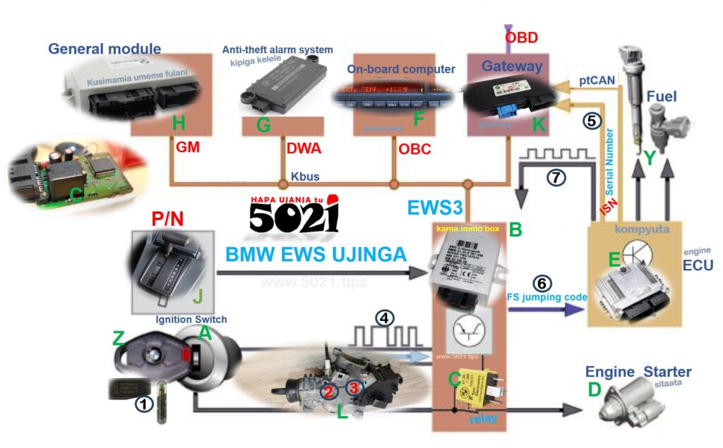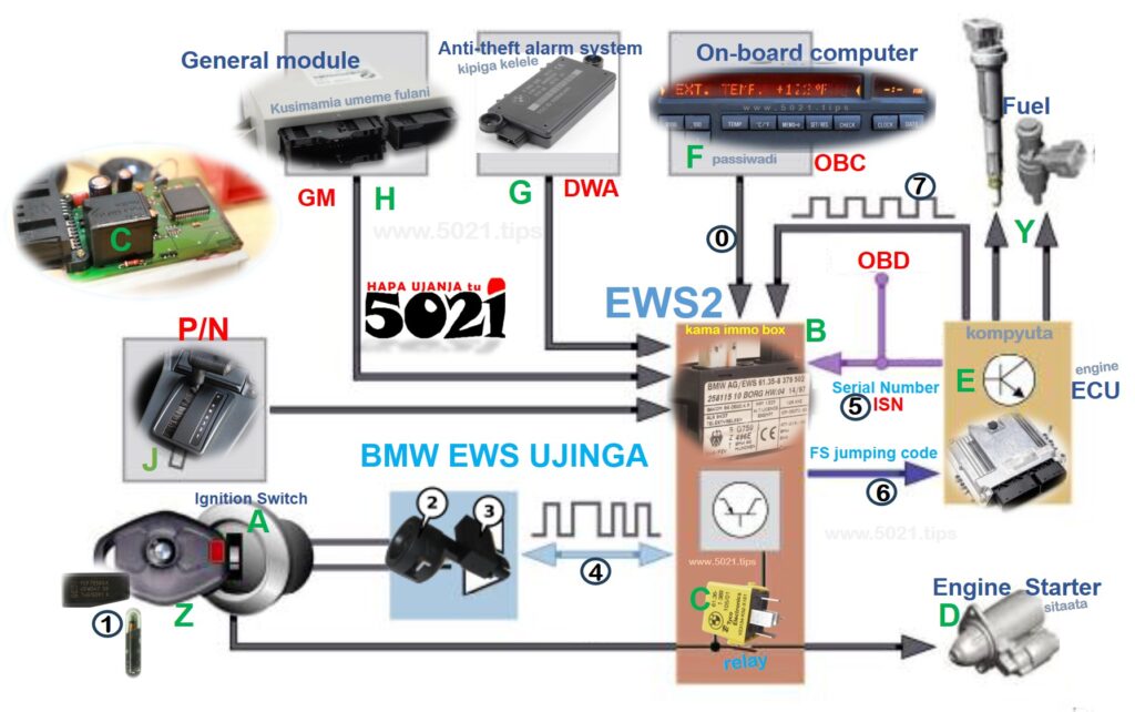 6) This ‘engine-start’ enable code contains information on the EWS control unit that is compared with the already programmed information in the ECU.