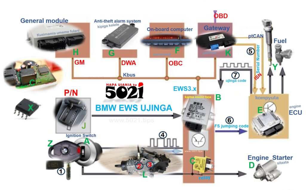 3) The Transceiver module for data exchange would translate for EWS module, B, whatever data, 4, from 1, the transponder chip in the key, Z!